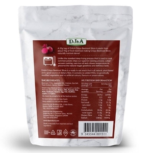 DJ&A Crispy Beetroot Slices is all natural, Plant Based and a good source of dietary fibre. It contains no added MSG, no genetically modified vegetables and no artificial colours, flavours or preservatives.