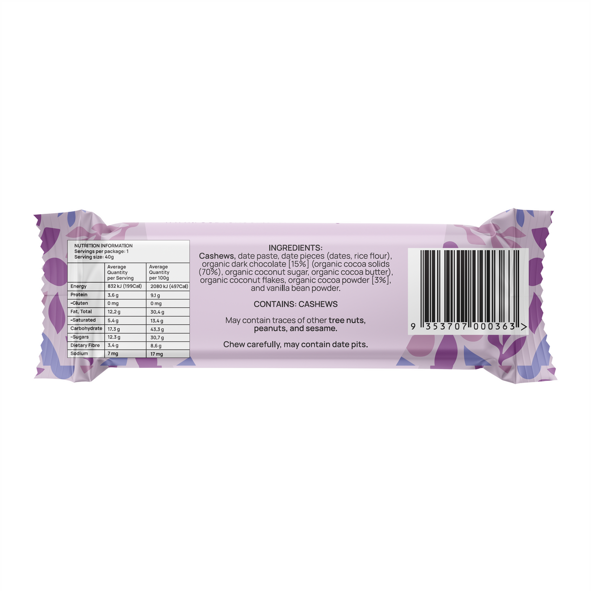 Organic sprouted cashews, organic medjool dates, organic dark chocolate [20%] (organic raw cacao paste, organic coconut sugar, organic cacao butter, cacao solids 64%), organic cocoa powder [3%], organic coconut flakes and vanilla bean powder.