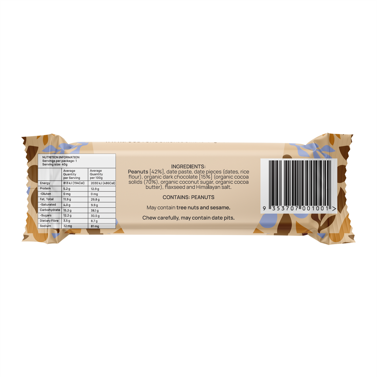 Organic peanuts [51%], organic medjool dates, organic dark chocolate [20%] (organic raw cacao paste, organic coconut sugar, organic cacao butter, cacao solids 64%), organic coconut flakes and Himalayan salt.