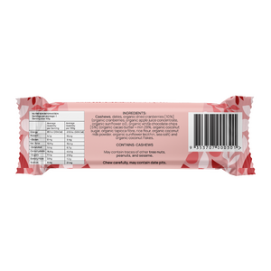 A delicious bar made with organic sprouted cashew nuts, organic medjool dates and tart organic cranberries. We’ve added high quality organic white chocolate chips that are free from dairy, soy and palm oil.